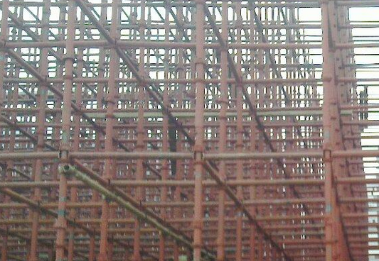 由于該工程施工工期緊,難度大,質(zhì)量要求高,但為了確保11731交安和12630中交目標的實現(xiàn),對高度9m和19m處的框架梁采用鋼管腳手架作支撐,施工規(guī)范“腳手架結(jié)構(gòu)模板支撐架的構(gòu)造和設(shè)計”中明確規(guī)定要求:采用腳手架桿配件搭設(shè)模板支撐架是常用的施工方法之一。