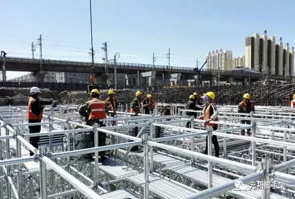 以中鐵六局承辦的內(nèi)蒙古呼和浩特市鐵路下穿立交橋項目為例,該項目就是使用元拓的圓盤式腳手架支撐體系來完成的。項目現(xiàn)場兩個框構(gòu)橋,一個長38米,寬16米,高8米;另一個長38米,寬22米,高7.6米。
